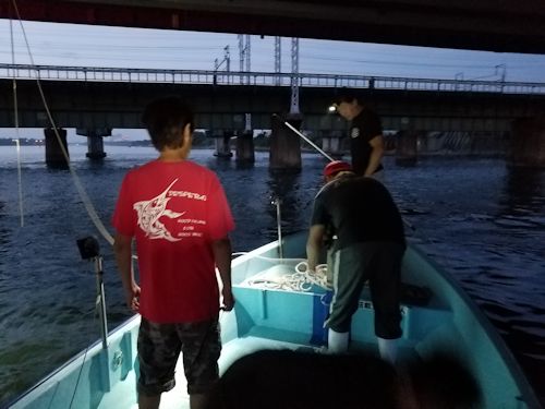 まず小さい和船を、橋げたに固定して流れないようにする。