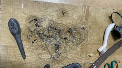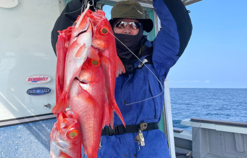 船に乗ると、みんなマミやエポックのガチタックル。錘400号銅付き針12.3本くらい。