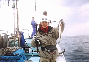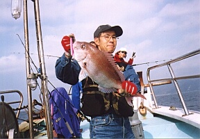 | 悲劇はさらに続く。 ミヨシで頑張るぴすけ君が何やら掛けた。 水深が深く、なかなか上がってこない。 「た、タイや〜!」 船上に響く声。 丁寧にネットで取り込まれたのはなんとも美しいマダイ! 全長なんと55cm! 青い星が散りばめられた実に美しい魚体。 「いいなぁ〜、私もタイ釣りた〜い!」とさくらさん。 あんた、まだ釣るつもりなんか?・・・(怖) | ![]() |