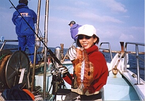 今回は勉強の意味もあってスピニングタックルでのキャスト&横シャクリに挑戦する私。 さすがにベテラン両氏のような美しいジャークはできないが自分なりのやり方で何匹か釣ることは出来た。 しかしこの方法は腕の疲労も半端では無い。 3回も連続でやるとヘロヘロになってしまう。 「てんびん君、あんたら一日中こんな釣りしてんの?」 聞いた私がアホでした。 「あたりまえやん! ジギングは修行やで!」 わたしゃまだまだ修行が足りません・・・(^^ゞ さてさて、すでにハマチを釣り飽きたさくらさん。 見れば竿の動きが何やら怪しい・・・。 「アコウ、アコウ、鍋、鍋・・・」 彼女の背中から怪しい念がうかがえる。 「狙って釣れたら苦労しないよ・・・」 と思ったら彼女の竿にガツガツと反応が! 「ヒット〜♪」 え?うそ!エソでも釣ったんじゃない?と思ったがなんとも立派なアコウを釣り上げた。 |