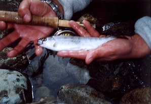 ![]() やっと釣れたヤマメちゃん。 サイズは気にしない・・・ |