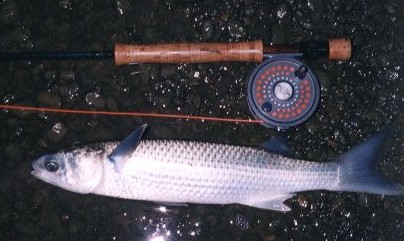小さなクレージーチャーリーを3Xティペットに結びボラで沸き返る流れに第一投!やや沈めてスローにリトリーブ。すると「ぐぐっ」と引っ掛かって「ビュイーン!」と走られ、止めようと思ったらバレた。やはりスレ掛かりである。リトリーブを止めてウエット風にドリフトさせてみるが結果は同じ。フライを変えポジションを変えマーカーを着けてもやはりスレ掛かり。持っているフライは管理釣り場のニジマス用に巻いたモノが中心なのでフックサイズは#10〜14。できるだけ小さいフライを選んで頻繁にカラーチェンジを試みるが100%スレ掛かりだ。 スレで掛かるボラのファイトは悪くない。スピード、パワー、重量感、そして往生際の悪さ。強烈なファイトはFFタックルで遊ぶには申し分ないモノだ。ただしスレで掛かっているのでほとんどがバレてしまう。バッキングラインまで引き出す強烈なジェットランの直後、巨大なウロコをフックに残して去っていく巨ボラ。口にさえ掛かっていたら絶対獲ってやるのに〜!!! |