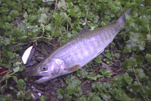| ライバルの釣果とは言えイワナを見るのは久し振りの私。流域ごとに異なる遺伝情報を持つ日本固有の渓流魚である。ヤマメやアマゴより間の抜けた表情、独特の模様、細くクネる魚体。このイワナが妙ちくりんなスプーンで釣れてしまうのだから困ったものである。 | ![]() |