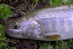 大量のコゴミと共に入溪地点に戻ると妙にニヤついた黒田氏が居た。むむむ・・・ヤな予感・・・。氏が手にしたポリ袋の中には元気なイワナが泳いでいた。「や、やられたぁ〜」こっちがコゴミ採りに夢中になってる間にしっかり釣られてしまった。それも兵庫県では珍しいイワナである。 |