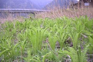 今回の釣行にはもうひとつ目的がある。それは「コゴミ」と呼ばれる山菜なのだがサクラマスで通うポイントには何故かコゴミが多い。ボーズがお約束のサクラマス釣りを何年も続けられるのもコゴミのお土産が期待できるからだろう。 |