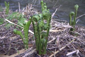 | 激流を渡り対岸にたどり着き、ふと足元に目をやると、「おぉ!コゴミやんけ〜!!」標高があり山陰になる影響なのか、ちょうど食べ頃の芽も多い。これは皆に教えないと、と携帯電話を手にするが残念ながら圏外表示。しょうがないから独り占めである。フッフッフ・・・ | ![]() |