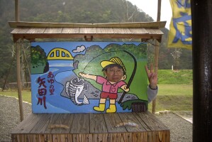 | 小場所だけに1時間ほどで切り上げ狙いを渓流に切り替えて上流部へ向かう。コゴミも上流部に行けば食べごろに違いない。 途中、昼食の為に立ち寄った「道の駅」で爆釣の証拠写真を撮影し、一行はさらに進む・・・ |