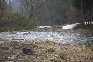 矢◆川上流○△地区。5年程前にフライで攻めた流域だが入溪地点が限られ攻め難い川である。雪代の影響か水量は意外に多く、流れは身を切るほどの冷たい。日陰には残雪も見える。「フライで勝負になるかな・・・」今年#3ロッドを新調した私はどんどん上流へ移動し積極的にポイントを探す。 |