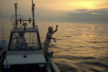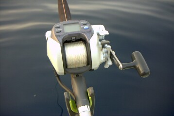 その後スズキの反応は無く、本命のイカポイントへ移動。ジギングロッドに山尾さんが用意してくれたスッテ仕掛けを付け水深40m前後を攻める。まだ明るい時間だが1匹目がヒット!続いて2匹目も釣ることが出来たが後が続かない。見渡せば漁火で一面の日本海、まだまだ勝負はこれからだ。 夜がふける頃からはアジ釣りが始まる。専用タックルの無い私に船長が用意してくれたタックルはインターラインの長い竿に高性能電動リール!「落とすと高いから注意してね」と松田船長。「いくらするの?」「10万円ぐらいかな〜」 ・・・・・・(-_-;) 竿受けにセットしたアジ用タックルに注意を払いつつ、ジギングロッドでスッテをしゃくりイカを誘う段取りのようだ。なんか大変な釣りになって来たぞ・・・。 |