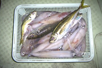 すっかり深夜になった午前2時前に鳥取港に戻る。中嶋さんの替わりに松田船長が頑張ってくれたのでイカもアジもそこそこの漁獲になっていた。「手のかかる素人」もイカは頑張って20匹ほど釣ったが、アジはたったの4匹と実力通り。結局は皆さんが釣ったアジを良型ばかりタップリ頂いて帰ることになり最初から最後まで世話になりっぱなしでありました。 お土産としては相当にグレードの高い日本海のケンサキイカと巨大アジ。実家の両親や兄弟で集まって食し、たった2日でほとんど食い尽くしてしまった。「もう無いの?」「次はいつ行くの?」食べるだけの人はお気楽なもんである。誰か私にも釣ってきてくれないかな〜と思いつつ、電動リールのカタログにチェックいれる私でした。 |