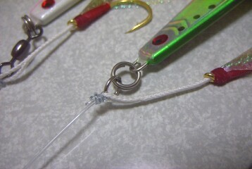スナップ接続でリーダーに結びこんだ状態。 ジグを替えてもフックは残るので便利! |