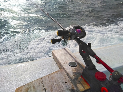 エサは活アジ。 自作仕掛けに錘40号。 水深20〜40m