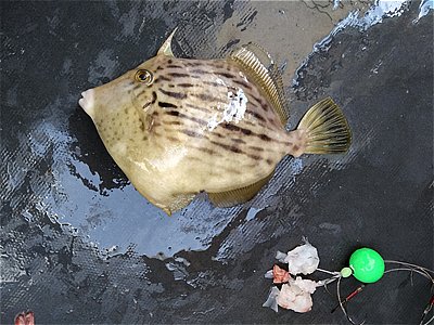 潮が緩むと湾フグタックルと15号錘。 カワハギも混じって11フグ。