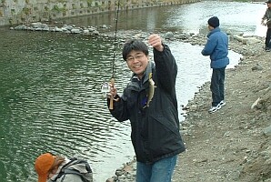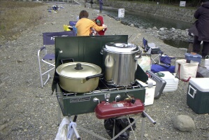 | ネットの釣り仲間は何故か宴会好き。 そんな我々の新年会は管理釣り場での野外宴会です。 場所はさくらさんご推薦の「芥川ルアー・フライ釣り場」 区間貸切が出来るので宴会にはピッタリ! 幸運にも天候に恵まれた当日、大量の食材と野営道具を持ち込んで盛大なる野外宴会が開催されました。 |