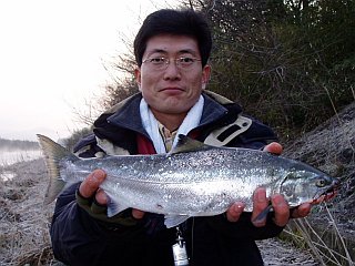 06時00分:薄暗い内に一級ポイントに入りゲーム開始。 06時20分:サクラマス初挑戦の三上氏に可憐なサクラマスがヒット! |