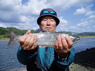| すっかり寝過ごした06時30分。 OPA!黒田部長からの電話で起きた私。 く「千代川でサツキマス釣りましたよ!」 ふ「ほ〜、そりゃおめでとう! サツキなら赤い点があるはずですが見えますか?」 く「う〜ん、赤い点なんか無いよ。」 ふ「それならサクラマスですよ! いや〜凄い凄い!良かったですね♪」 く「お!そうか!ついにやったんだな! 悪いけど写真撮りに来てよ!」 ふ「ハイハイ、3時間ほどお待ち下さいね。」 と言う訳で2台のカメラを持って07時に自宅を出発。 およそ150kmを爆走して09時に千代川に到着。 さっそく撮影となりました。 |