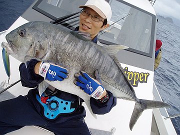 | 25日09時50分 ナブラ狙いの一投目。GTガンマ160でヒット! しかし、バットエンドをギンバルベルトに刺すタイミングを誤ってバラシ。 結局3日間で4発掛けて3バラシ1キャッチでした。 |