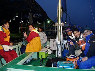 トロB組長かわむらさん御一行と共に乗船。 釣るぞ〜! |