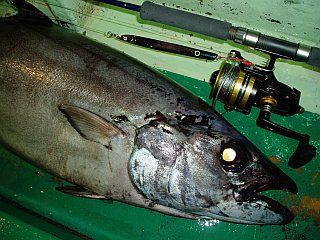 グロー系でアタリが無くなったのでジャックナイフの黒にサンマとアオリイカをセット。 85mから激しいストップ&ゴーで巻き上げると大型サットウの入れ食いモードに突入! |