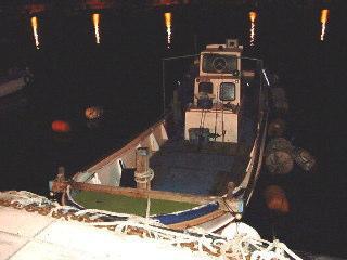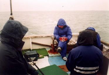 | なかなか釣れないし雨降ってるし寒いし・・・さすがの私も気合が抜けてきた。 70歳の船長は小刻みにポイント移動を繰り返すが単発ヒットのみ。 結局、舳先の若者が3本、私と艫の客が1本、ボーズ2名のお寒い結末。 爆釣モードだったら使うつもりでミニチュアダックスを2本も持ってきたのに何の役にも立たず、ジワジワ浸水する安物雨具のおかげで翌日は熱まで出る始末。 まさに今世紀最後のジギングを飾る見事な結末と言えましょう。 フ〜、ヤレヤレ・・・ |
