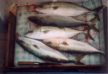 | 夏以来、異常に釣れている明石のハマチ。 20世紀最後を爆釣で飾るつもりでちょっと期待して出かけました。 今回は林崎から出船するS丸。 しかし5時半出船だと言うのに船長は来ないし客は遅れるしで6時半の出港。 おまけに雨まで降ってきた。 常連によると「爆釣明石」はすでに終わり、ここ数日は厳しい釣りが続いているらしい。 う〜ん、調査不足だったか・・・。 |